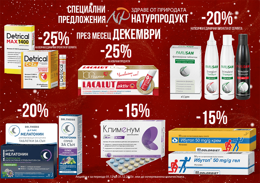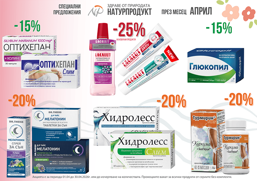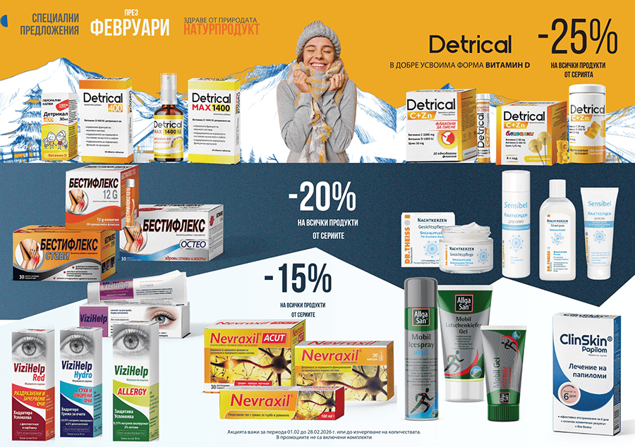 Пожелайте си здраве, а ние ще ви го осигурим! Това е нашето мото, което ни води напред и ни кара да не спираме да се развиваме. На пазара сме повече от 20 години, а за в бъдеще целим да се разрастнем още повече и да се наложим като една от най-добрите онлайн аптеки в България. За нас качеството и професионализмът са неща с фундаментално значение, с които никога не правим компромиси. Екипът ни се състои от опитни фармацевти, посветени на работата си и винаги готови да ви консултират по всеки здравен казус.